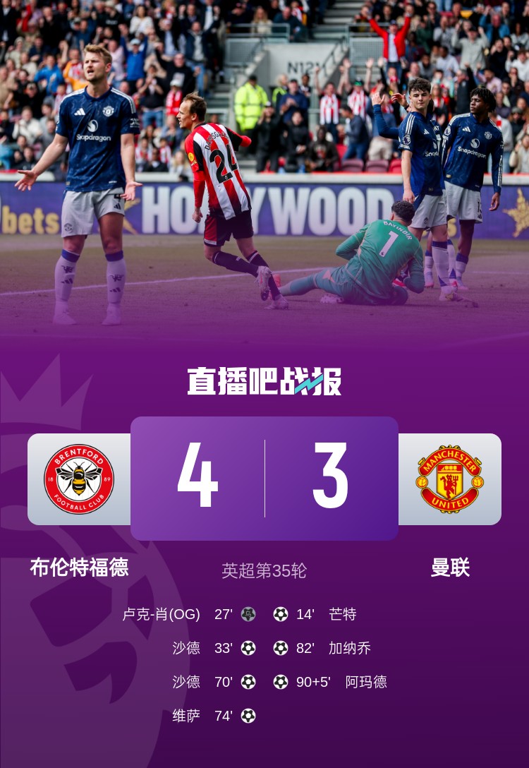 英超第35輪,曼聯3-4布倫特福德,近6輪比賽不勝。上半場,梅努挑傳策動進攻,加納喬助攻芒特破門,盧克-肖自擺烏龍,沙德頭球破門,德里赫特傷退;下半場,沙德為布倫特福德再下一城,維薩建功,加納喬世界波,阿瑪德補時破門。