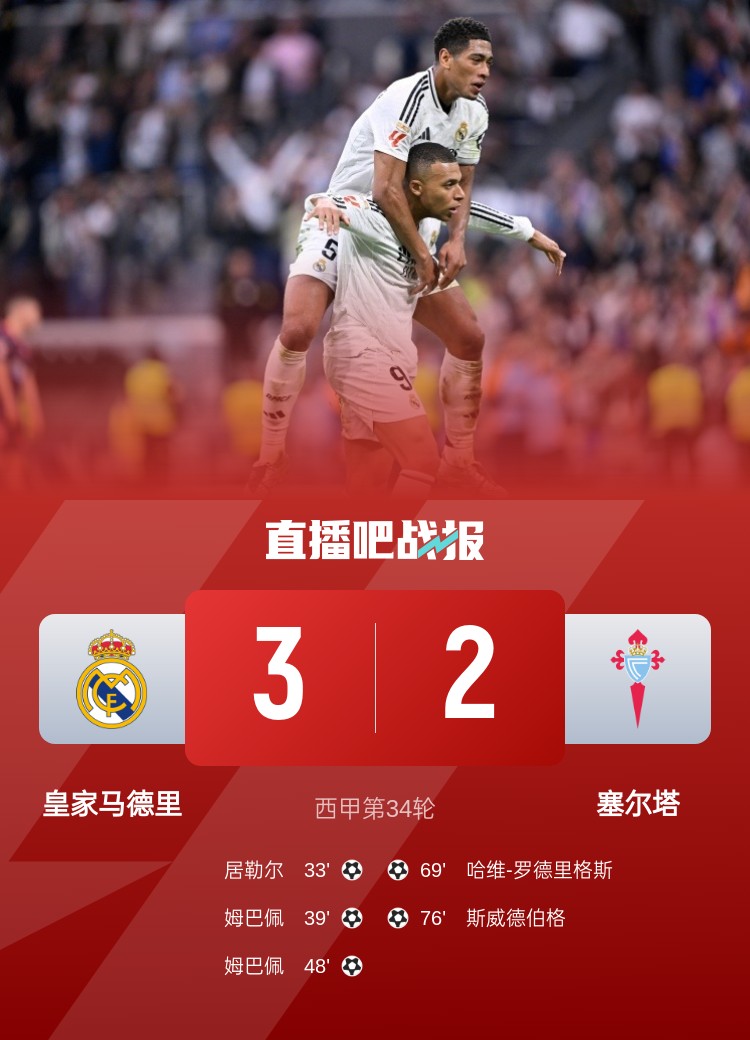 西甲第34輪,皇馬3-2險勝塞爾塔。上半場,居勒爾世界波+聯賽連場破門,姆巴佩倒地滑射破門,貝林厄姆助攻+飛鏟染黃;下半場,姆巴佩再下一城+賽季第36球,居勒爾傳射,皇馬7分鐘連丟2球。