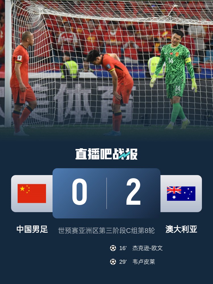 中國男足主場迎戰澳大利亞。黃政宇滑倒送禮+王大雷黃油手致丟球,國足主場0-2不敵澳大利亞,國足3連敗+連續2場遭零封。