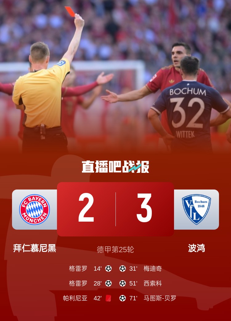 德甲第25輪,拜仁2-3遭波鴻逆轉。上半場,格雷羅爆射破門,薩內造點、格納布里失點,穆勒助攻格雷羅雙響,梅迪奇扳回一球,帕利尼亞直紅;下半場,西索科頭球扳平,貝羅反超比分。