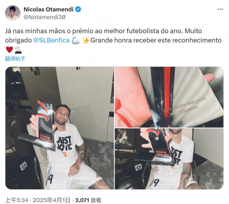 2025-04-01 12:02:1237歲奧塔門迪當選本菲卡年度最佳球員,社媒曬手拿獎杯照片